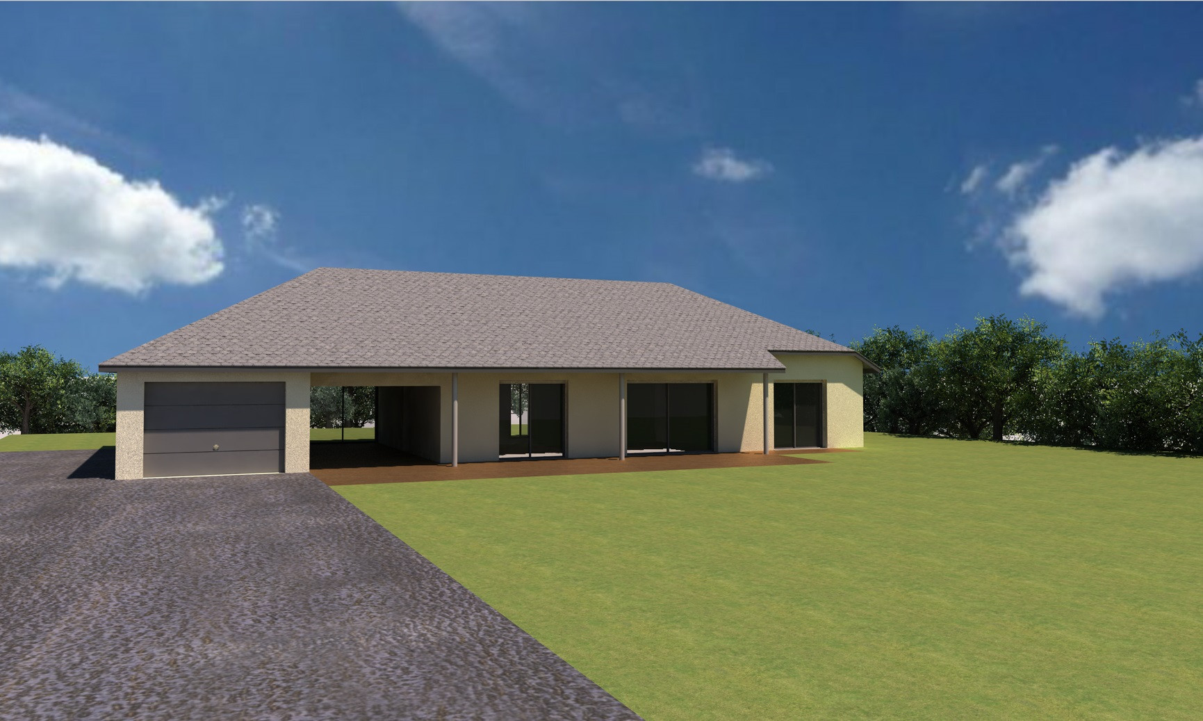 Maison présentée : Maison de plain-pied au style traditionnel composée de 3 chambres et une salle de bain avec grand bac à douche extraplat et double vasques. Une pièce de vie avec cuisine ouverte de plus de 55 m², un garage avec cellier attenant de plus de 32m².